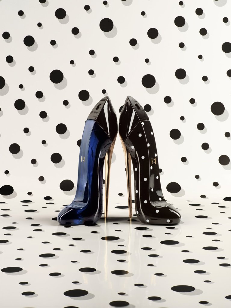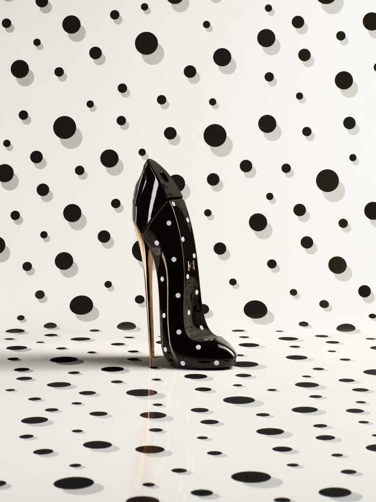 El mítico tacón stiletto negro, se viste en esta edición limitada de negro y de lunares blancos, una textura relacionada con los orígenes de la marca neoyorkina, que aparece nuevamente gracias a colaboración de la modelo e imagen del perfume Karlie Kloss y Carolina Herrera de Baez, directora creativa de los perfumes de la casa, quienes buscaron juntas en los archivos de la compañía la inspiración que adorna el nuevo frasco.
