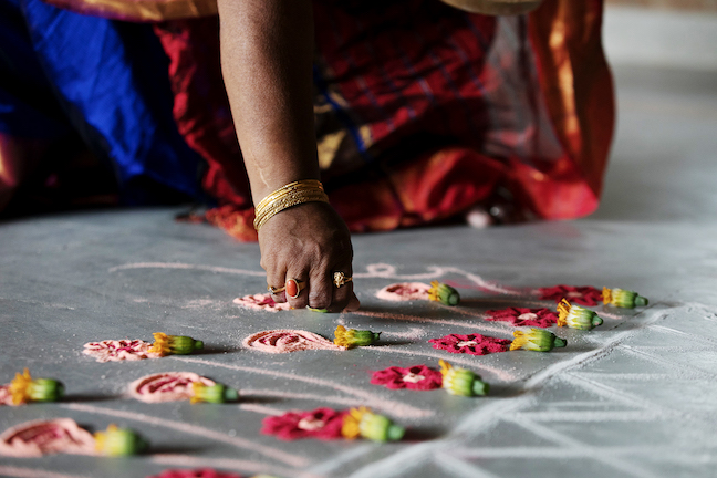 El empaque de ambas referencias es adornado con imágenes que muestran el proceso de creación de un Kolam junto con los colores utilizados para crear estos dos nuevos perfumes.