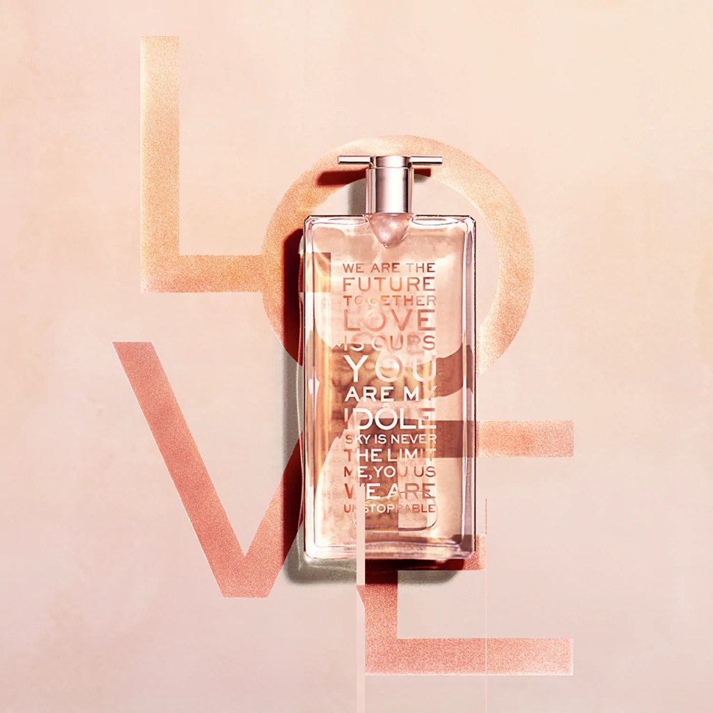 Esta nueva fragancia mantiene el mismo aroma fresco y floral de su versión inicial Idole Eau de Parfum, lanzado en el 2019. En esta ocasión su botella, catalogada como una de las más delgadas del mundo, con solo 15 mm de grosor, esta decorada con letras doradas que escriben un mensaje de amor, unión y empoderamiento, una manera muy particular para expresar nuestros sentimientos.