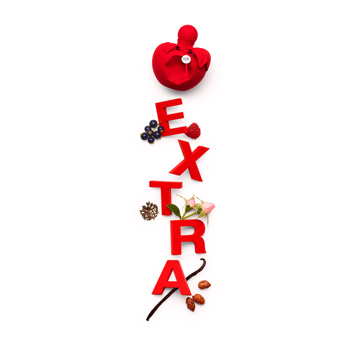 El frasco de Nina Extra Rouge, conserva la forma de manzana mordida de la edición Nina Rouge, reinventándose al reemplazar su efecto esmaltado y brillante por un acabado suave y aterciopelado, en donde el color rojo se vuelve aun más rojo.