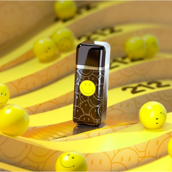 La famosa píldora de color rosa de la linea 212 VIP Rosé se adorna en su base con una trama de sonrientes carita , enseñando en la parte frontal del frasco la alegre y popular carita amarilla de Smiley.