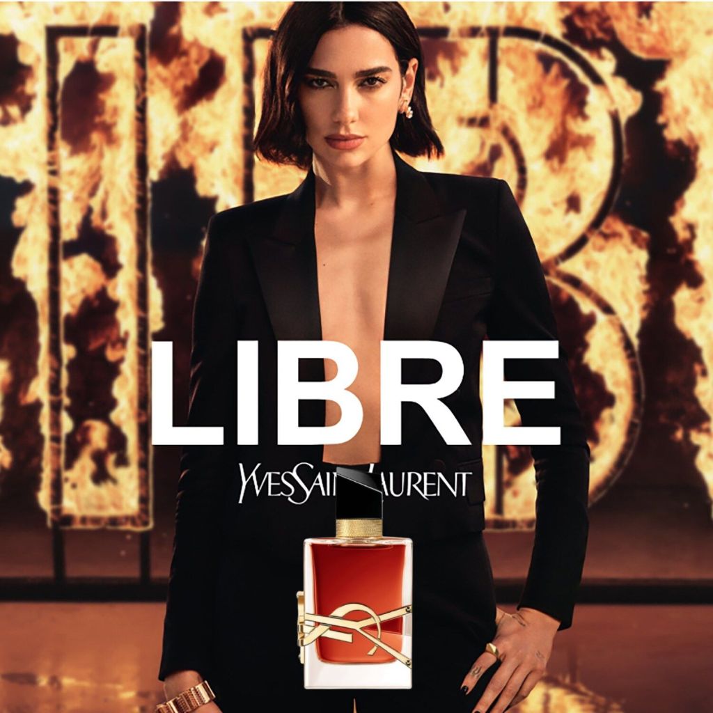 Yves Saint Laurent ficha nuevamente a la cantante Dua Lipa para ser la imagen de «Libre Le parfum», quien aparece vestida una vez más con un smoking negro en un escenario colmado de llamas.