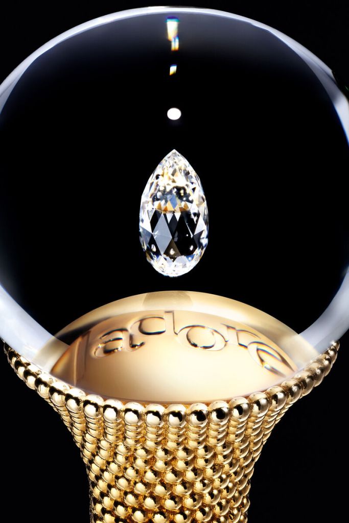 Esta edición limitada utiliza nuevamente la lujosa y curvilínea ánfora de todos los perfumes j’adore, pero convirtiéndose en una exclusiva pieza de joyería al tener en su tapón un diamante sintético de 2,2 quilates tallado en forma de briolette de 231 facetas, evocando elegantemente una gota de perfume, logrando atrapar y multiplicar la luz en cada movimiento. El collar de su tapón está cubierto en oro de 18 quilates, haciendo de esta botella no cualquier botella sino una escultura de lujo pensada para coleccionistas.
