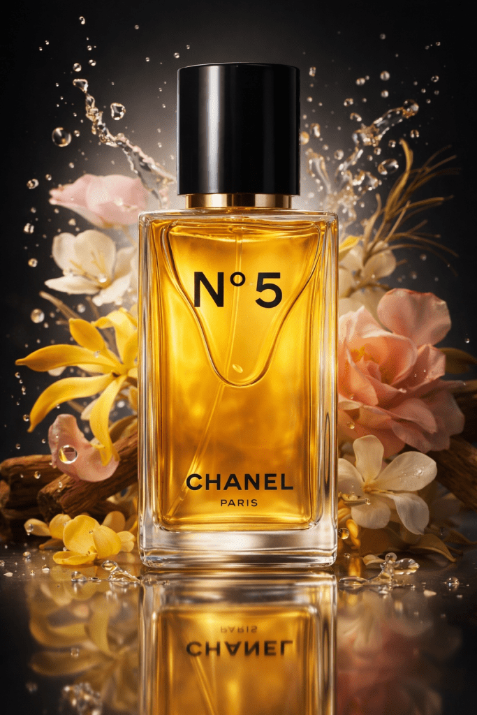Mira la imagen. Es una lección de arquitectura. El frasco de 2026 abandona la robustez cuadrada por una silueta más esbelta y vertical. Los hombros del frasco son marcados, decididos. El tapón negro azabache crea un contraste dramático con el líquido dorado, una metáfora visual del día y la noche. El logo «N°5» flota en el centro, minimalista, casi desafiante. No necesita más. Es una pieza de cristal que pide ser tocada, un objeto de deseo que se siente pesado y valioso en la mano.